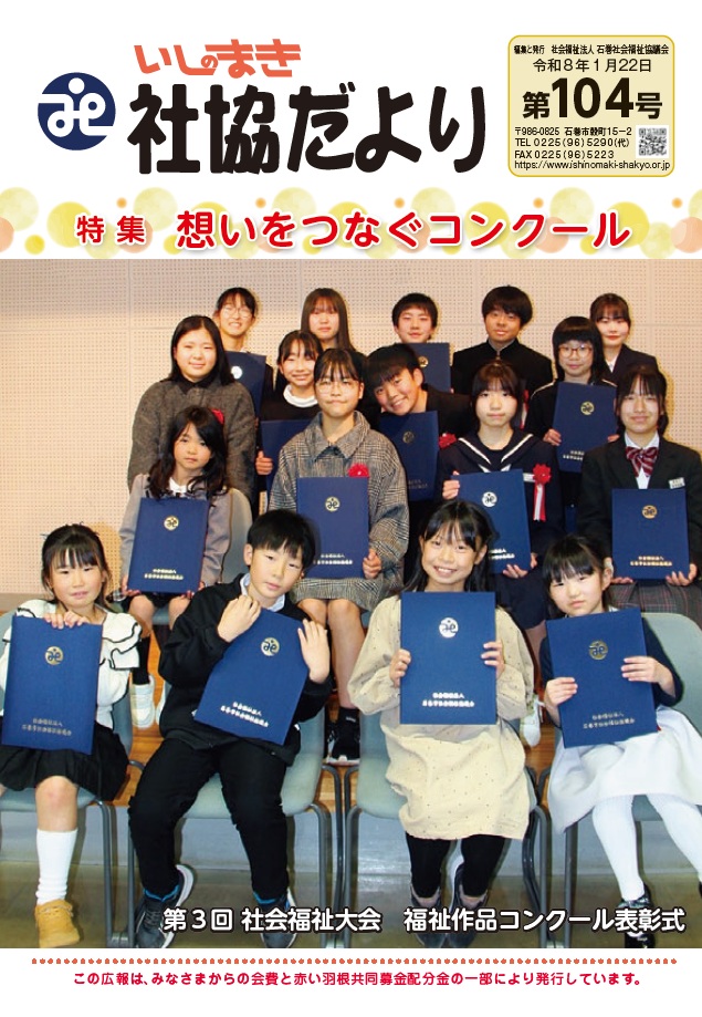 ようこそ社協へ 各拠点のご案内 各拠点のページへ ※詳細は各拠点をタップ 本所のご案内 〒986-0825 宮城県石巻市穀町15番2号 石巻市ささえあいセンター3階 電話番号 0225(96)5290 FAX番号 0225(96)5223 第104号(令和8年1月22日発行) バックナンバー